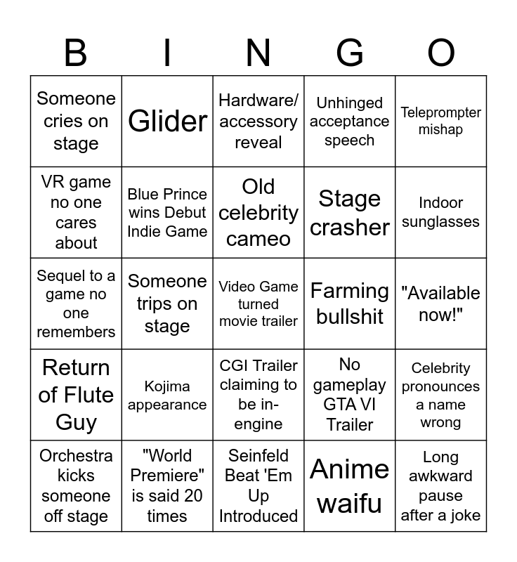This bingo card has a free space and 24 words: Kojima appearance, "World Premiere" is said 20 times, Old celebrity cameo, Orchestra kicks someone off stage, Teleprompter mishap, Someone cries on stage, VR game no one cares about, Glider, Farming bullshit, CGI Trailer claiming to be in-engine, Stage crasher, Sequel to a game no one remembers, No gameplay GTA VI Trailer, Celebrity pronounces a name wrong, Blue Prince wins Debut Indie Game, Anime waifu, "Available now!", Hardware/ accessory reveal, Indoor sunglasses, Someone trips on stage, Long awkward pause after a joke, Return of Flute Guy, Unhinged acceptance speech and Seinfeld Beat 'Em Up Introduced.