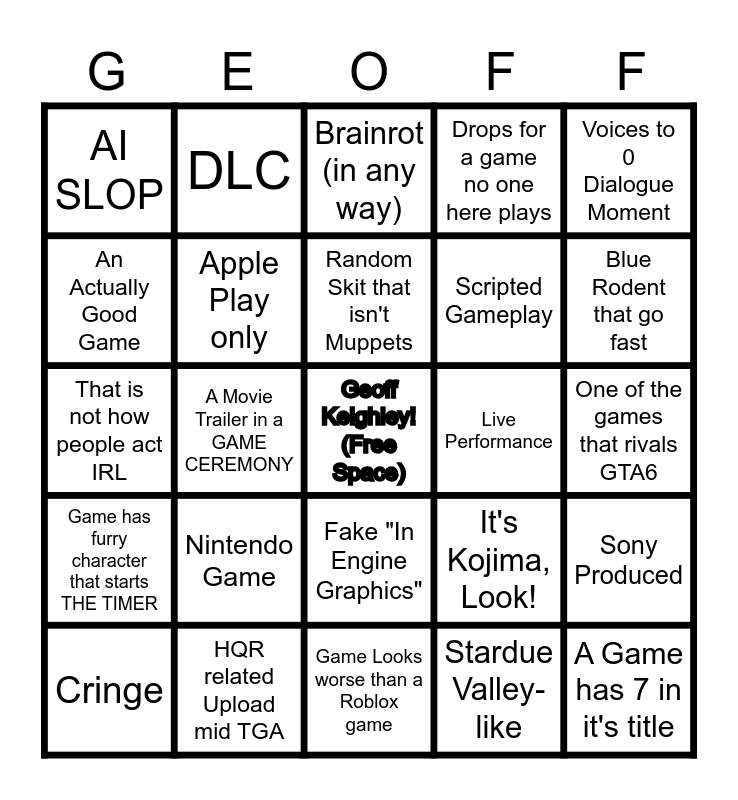 This bingo card has a free space and 24 words: Nintendo Game, HQR related Upload mid TGA, Random Skit that isn't Muppets, Cringe, Voices to 0 Dialogue Moment, AI SLOP, An Actually Good Game, DLC, Live Performance, Fake "In Engine Graphics", Scripted Gameplay, That is not how people act IRL, It's Kojima, Look!, Sony Produced, Apple Play only, Stardue Valley-like, One of the games that rivals GTA6, Brainrot (in any way), Blue Rodent that go fast, A Movie Trailer in a GAME CEREMONY, A Game has 7 in it's title, Game has furry character that starts THE TIMER, Drops for a game no one here plays and Game Looks worse than a Roblox game.