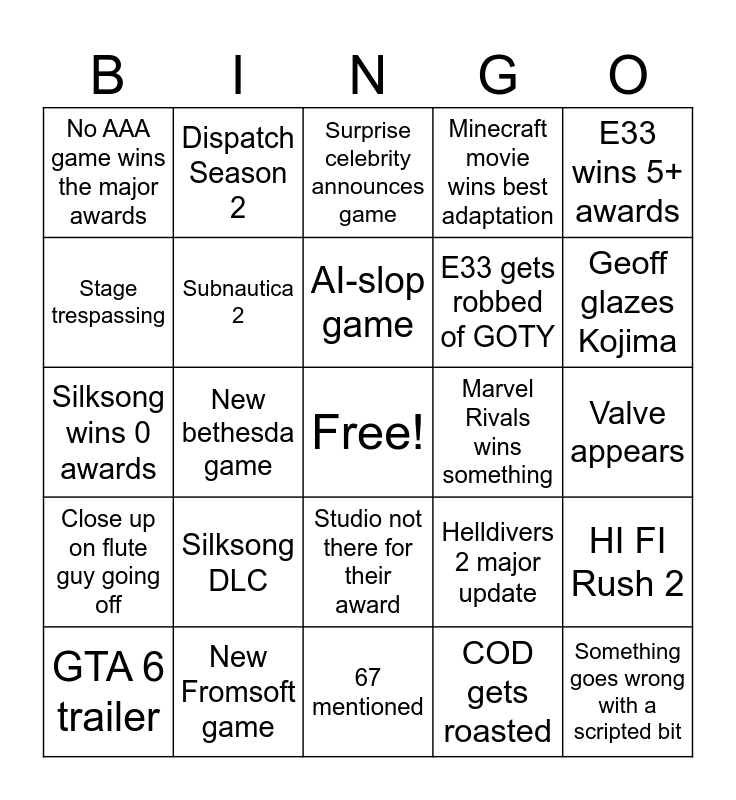 This bingo card has a free space and 24 words: Silksong DLC, New Fromsoft game, AI-slop game, GTA 6 trailer, E33 wins 5+ awards, No AAA game wins the major awards, Stage trespassing, Dispatch Season 2, Marvel Rivals wins something, Studio not there for their award, E33 gets robbed of GOTY, Silksong wins 0 awards, Helldivers 2 major update, HI FI Rush 2, Subnautica 2, COD gets roasted, Valve appears, Surprise celebrity announces game, Geoff glazes Kojima, New bethesda game, Something goes wrong with a scripted bit, Close up on flute guy going off, Minecraft movie wins best adaptation and 67 mentioned.