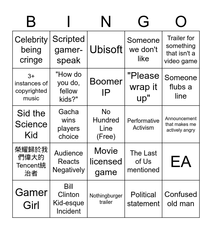 This bingo card has a free space and 24 words: Audience Reacts Negatively, Bill Clinton Kid-esque Incident, Boomer IP, Gamer Girl, Trailer for something that isn't a video game, Celebrity being cringe, 3+ instances of copyrighted music, Scripted gamer-speak, Performative Activism, Movie licensed game, "Please wrap it up", Sid the Science Kid, The Last of Us mentioned, EA, "How do you do, fellow kids?", Political statement, Announcement that makes me actively angry, Ubisoft, Someone flubs a line, Gacha wins players choice, Confused old man, 榮耀歸於我們偉大的Tencent統治者, Someone we don't like and Nothingburger trailer.