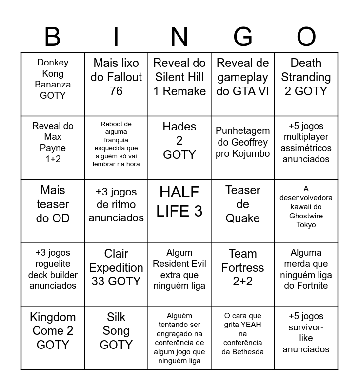 This bingo card has a free space and 24 words: Clair Expedition 33 GOTY, Silk Song GOTY, Hades 2 GOTY, Kingdom Come 2 GOTY, Death Stranding 2 GOTY, Donkey Kong Bananza GOTY, Reveal do Max Payne 1+2, Mais lixo do Fallout 76, Teaser de Quake, Algum Resident Evil extra que ninguém liga, Punhetagem do Geoffrey pro Kojumbo, Mais teaser do OD, Team Fortress 2+2, Alguma merda que ninguém liga do Fortnite, Reboot de alguma franquia esquecida que alguém só vai lembrar na hora, O cara que grita YEAH na conferência da Bethesda, A desenvolvedora kawaii do Ghostwire Tokyo, Reveal do Silent Hill 1 Remake, +5 jogos multiplayer assimétricos anunciados, +3 jogos de ritmo anunciados, +5 jogos survivor-like anunciados, +3 jogos roguelite deck builder anunciados, Reveal de gameplay do GTA VI and Alguém tentando ser engraçado na conferência de algum jogo que ninguém liga.