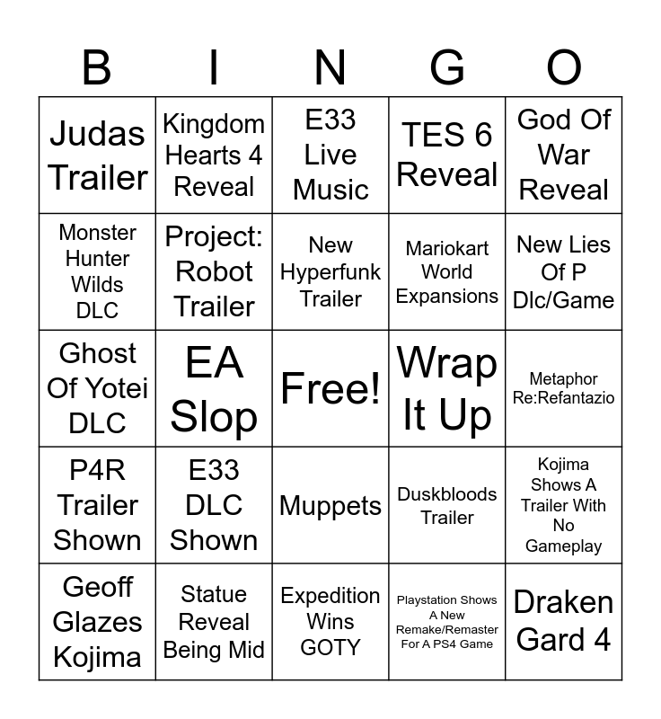 This bingo card has a free space and 24 words: E33 DLC Shown, Statue Reveal Being Mid, New Hyperfunk Trailer, Geoff Glazes Kojima, God Of War Reveal, Judas Trailer, Monster Hunter Wilds DLC, Kingdom Hearts 4 Reveal, Wrap It Up, Muppets, Mariokart World Expansions, Ghost Of Yotei DLC, Duskbloods Trailer, Kojima Shows A Trailer With No Gameplay, Project: Robot Trailer, Playstation Shows A New Remake/Remaster For A PS4 Game, Metaphor Re:Refantazio, E33 Live Music, New Lies Of P Dlc/Game, EA Slop, Draken Gard 4, P4R Trailer Shown, TES 6 Reveal and Expedition Wins GOTY.