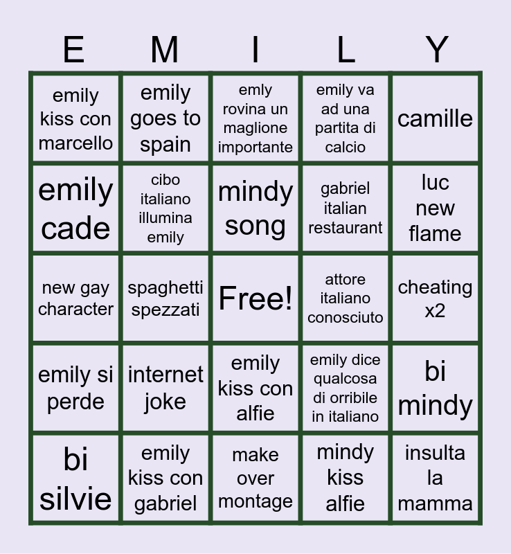 This bingo card has a free space and 26 words: emily kiss con alfie, mindy kiss alfie, mindy song, emily kiss con gabriel, camille, emily kiss con marcello, emily cade, emily goes to spain, cheating x2, emily dice qualcosa di orribile in italiano, gabriel italian restaurant, new gay character, bi mindy, bi silvie, spaghetti spezzati, cappuccino di pomeriggio, emily va ad una partita di calcio, emily si perde, emly rovina un maglione importante, insulta la mamma, luc new flame, make over montage, attore italiano conosciuto, internet joke, cibo italiano illumina emily and zoom sul gelato.
