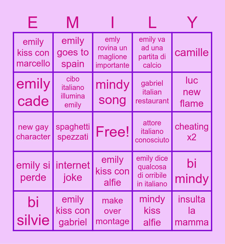 This bingo card has a free space and 26 words: emily kiss con alfie, mindy kiss alfie, mindy song, emily kiss con gabriel, camille, emily kiss con marcello, emily cade, emily goes to spain, cheating x2, emily dice qualcosa di orribile in italiano, gabriel italian restaurant, new gay character, bi mindy, bi silvie, spaghetti spezzati, cappuccino di pomeriggio, emily va ad una partita di calcio, emily si perde, emly rovina un maglione importante, insulta la mamma, luc new flame, make over montage, attore italiano conosciuto, internet joke, cibo italiano illumina emily and zoom sul gelato.