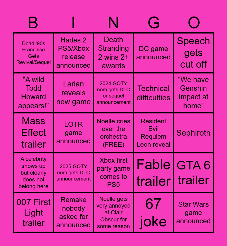 This bingo card has a free space and 38 words: Muppets show up, Marvel’s Wolverine trailer, Marvel Rivals character reveal, Larian reveals new game, GTA 6 trailer, 2025 GOTY nom gets DLC announcement, 2024 GOTY nom gets DLC or sequel announcement, “And it’s available now”, Speech gets cut off, Technical difficulties, LOTR game announced, DC game announced, Star Wars game announced, Sephiroth, "A wild Todd Howard appears!", A celebrity shows up but clearly does not belong here, Clair Obscur wins 3+ awards, Death Stranding 2 wins 2+ awards, Ghost of Yotei wins 2+ awards, Resident Evil Requiem Leon reveal, Dead ‘90s Franchise Gets Revival/Sequel, Remake nobody asked for announced, “We have Genshin Impact at home”, 007 First Light trailer, Atlus announces a non-Persona game, Noelle gets very annoyed at Clair Obscur for some reason, Mortal Kombat II movie trailer, Chris thinks something is Castlevania (it’s not), Half-Life 3 reveal, FFVII remake part 3 gets a title, Marvel's Blade trailer, Xbox first party game comes to PS5, 67 joke, Hades 2 PS5/Xbox release announced, Assassin’s Creed IV: Black Flag remake announced, Fable trailer, Mass Effect trailer and Marvel Tokon character reveal.