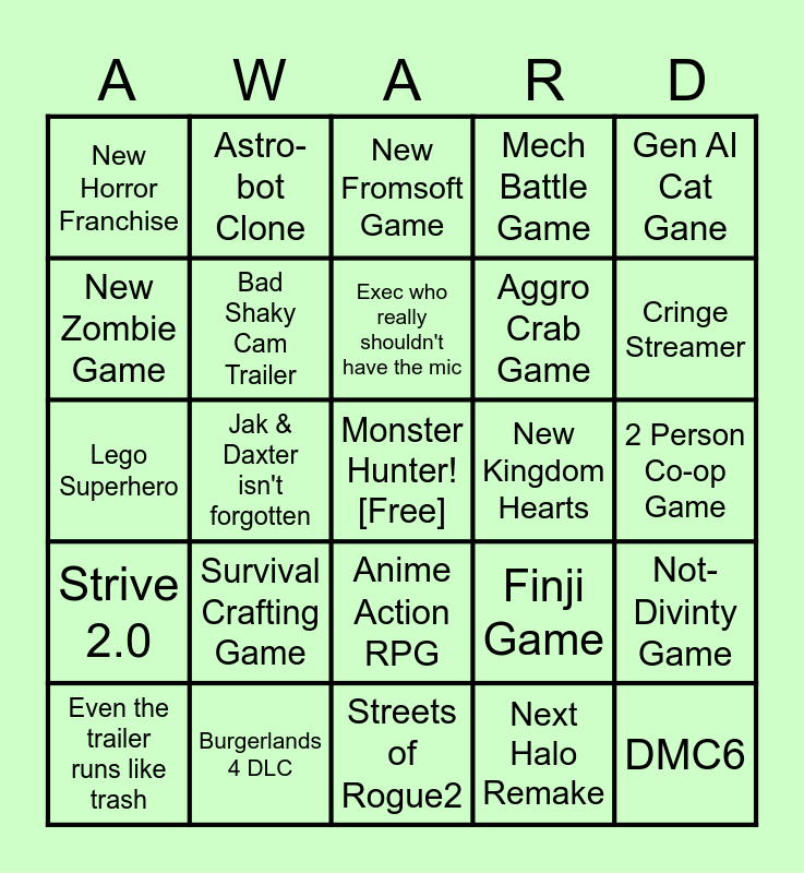 This bingo card has a free space and 24 words: Survival Crafting Game, Burgerlands 4 DLC, Exec who really shouldn't have the mic, Even the trailer runs like trash, Gen AI Cat Gane, New Horror Franchise, New Zombie Game, Astro-bot Clone, New Kingdom Hearts, Anime Action RPG, Aggro Crab Game, Lego Superhero, Finji Game, Not-Divinty Game, Bad Shaky Cam Trailer, Next Halo Remake, 2 Person Co-op Game, New Fromsoft Game, Cringe Streamer, Jak & Daxter isn't forgotten, DMC6, Strive 2.0, Mech Battle Game and Streets of Rogue2.