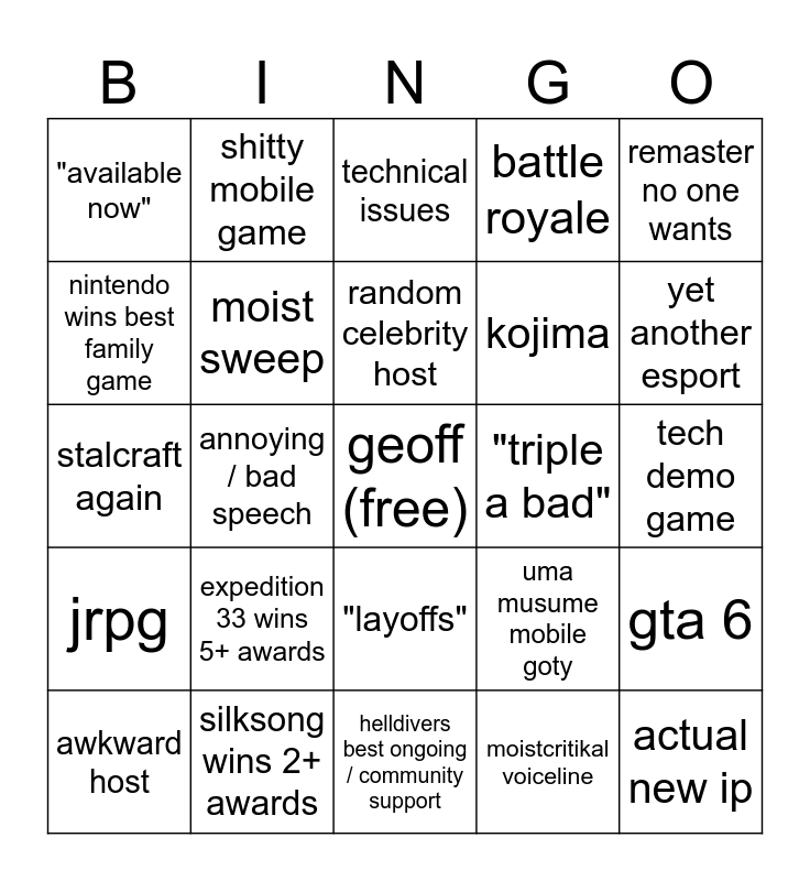 This bingo card has a free space and 24 words: expedition 33 wins 5+ awards, silksong wins 2+ awards, random celebrity host, awkward host, remaster no one wants, "available now", nintendo wins best family game, shitty mobile game, "triple a bad", "layoffs", kojima, stalcraft again, uma musume mobile goty, gta 6, moist sweep, moistcritikal voiceline, tech demo game, technical issues, yet another esport, annoying / bad speech, actual new ip, jrpg, battle royale and helldivers best ongoing / community support.