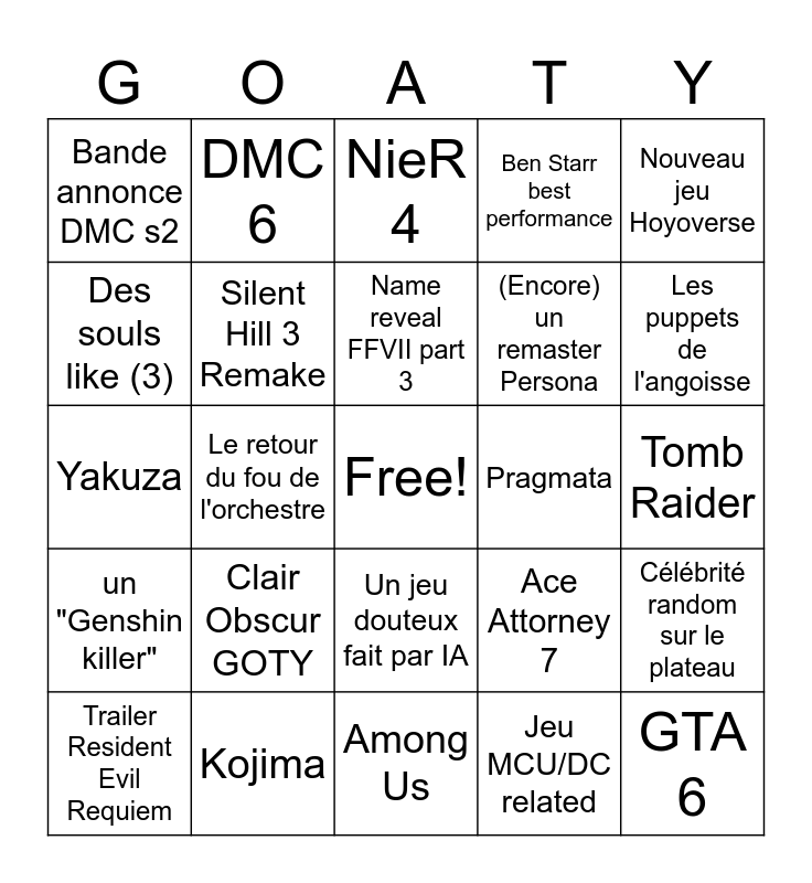 This bingo card has a free space and 24 words: Clair Obscur GOTY, Kojima, Name reveal FFVII part 3, Trailer Resident Evil Requiem, Nouveau jeu Hoyoverse, Bande annonce DMC s2, Des souls like (3), DMC 6, Pragmata, Un jeu douteux fait par IA, (Encore) un remaster Persona, Yakuza, Ace Attorney 7, Célébrité random sur le plateau, Silent Hill 3 Remake, Jeu MCU/DC related, Tomb Raider, NieR 4, Les puppets de l'angoisse, Le retour du fou de l'orchestre, GTA 6, un "Genshin killer", Ben Starr best performance and Among Us.