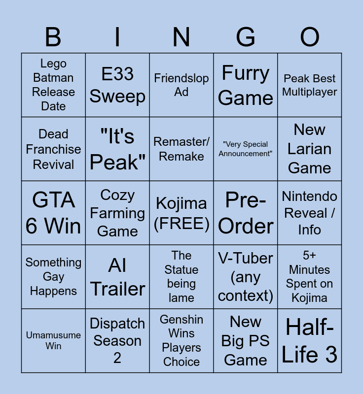 This bingo card has a free space and 24 words: AI Trailer, Dispatch Season 2, Remaster/ Remake, Umamusume Win, Peak Best Multiplayer, Lego Batman Release Date, Dead Franchise Revival, E33 Sweep, Pre-Order, The Statue being lame, "Very Special Announcement", GTA 6 Win, V-Tuber (any context), 5+ Minutes Spent on Kojima, "It's Peak", New Big PS Game, Nintendo Reveal / Info, Friendslop Ad, New Larian Game, Cozy Farming Game, Half-Life 3, Something Gay Happens, Furry Game and Genshin Wins Players Choice.
