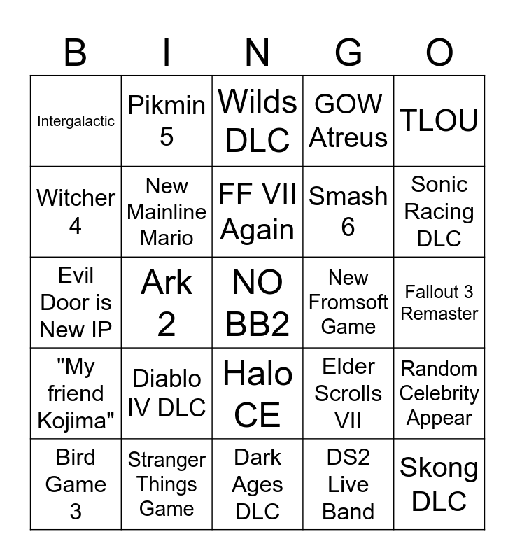 This bingo card has a free space and 24 words: Diablo IV DLC, Stranger Things Game, FF VII Again, Bird Game 3, TLOU, Intergalactic, Witcher 4, Pikmin 5, New Fromsoft Game, Halo CE, Smash 6, Evil Door is New IP, Elder Scrolls VII, Random Celebrity Appear, New Mainline Mario, DS2 Live Band, Fallout 3 Remaster, Wilds DLC, Sonic Racing DLC, Ark 2, Skong DLC, "My friend Kojima", GOW Atreus and Dark Ages DLC.