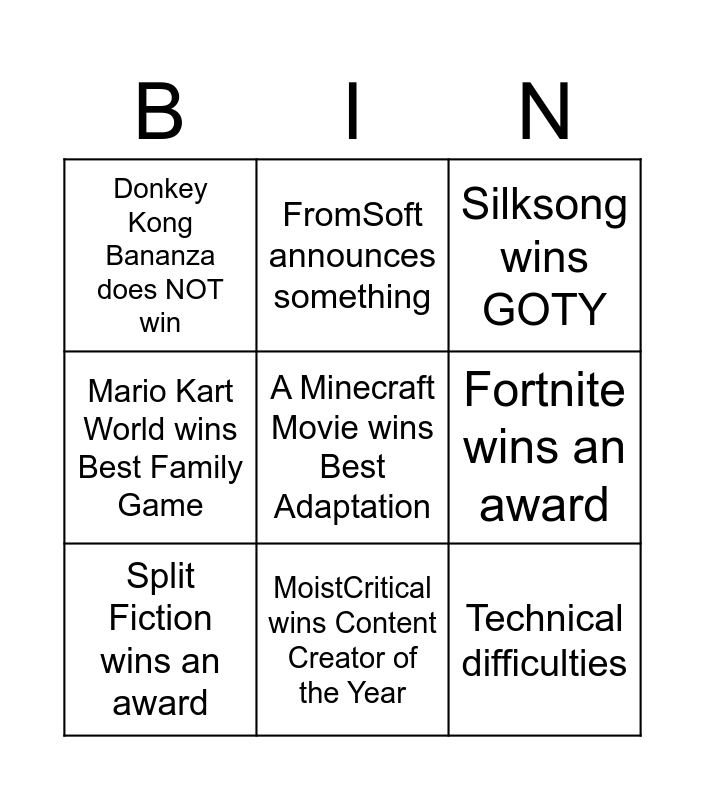 This bingo card has a free space and 8 words: Fortnite wins an award, Silksong wins GOTY, FromSoft announces something, Split Fiction wins an award, Donkey Kong Bananza does NOT win, Technical difficulties, Mario Kart World wins Best Family Game and MoistCritical wins Content Creator of the Year.
