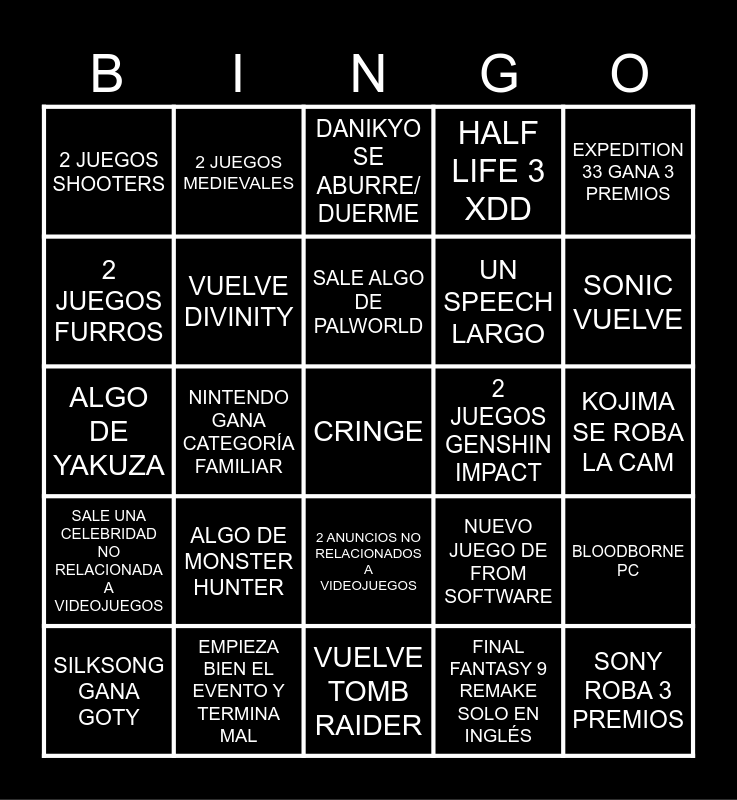 This bingo card has a free space and 24 words: ALGO DE MONSTER HUNTER, EMPIEZA BIEN EL EVENTO Y TERMINA MAL, SALE ALGO DE PALWORLD, SILKSONG GANA GOTY, EXPEDITION 33 GANA 3 PREMIOS, 2 JUEGOS SHOOTERS, 2 JUEGOS FURROS, 2 JUEGOS MEDIEVALES, 2 JUEGOS GENSHIN IMPACT, 2 ANUNCIOS NO RELACIONADOS A VIDEOJUEGOS, UN SPEECH LARGO, ALGO DE YAKUZA, NUEVO JUEGO DE FROM SOFTWARE, BLOODBORNE PC, VUELVE DIVINITY, FINAL FANTASY 9 REMAKE SOLO EN INGLÉS, KOJIMA SE ROBA LA CAM, DANIKYO SE ABURRE/ DUERME, SONIC VUELVE, NINTENDO GANA CATEGORÍA FAMILIAR, SONY ROBA 3 PREMIOS, SALE UNA CELEBRIDAD NO RELACIONADA A VIDEOJUEGOS, HALF LIFE 3 XDD and VUELVE TOMB RAIDER.