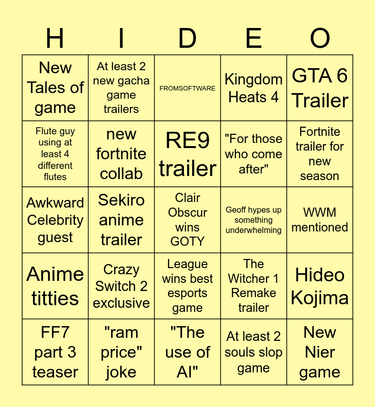 This bingo card has a free space and 24 words: FF7 part 3 teaser, Crazy Switch 2 exclusive, RE9 trailer, At least 2 souls slop game, GTA 6 Trailer, New Tales of game, At least 2 new gacha game trailers, FROMSOFTWARE, Geoff hypes up something underwhelming, WWM mentioned, Awkward Celebrity guest, new fortnite collab, The Witcher 1 Remake trailer, Hideo Kojima, Flute guy using at least 4 different flutes, "ram price" joke, "The use of AI", Kingdom Heats 4, Fortnite trailer for new season, Anime titties, Sekiro anime trailer, League wins best esports game, "For those who come after" and New Nier game.