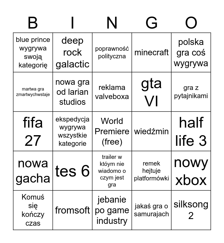 This bingo card has a free space and 29 words: Komuś się kończy czas, Ktoś wbiega na scene, ekspedycja wygrywa wszystkie kategorie, zapłaciliśmy dużo za wyniki, blue prince wygrywa swoją kategorię, poprawność polityczna, nowa gra od larian studios, tes 6, wiedźmin, fromsoft, half life 3, silksong 2, jebanie po game industry, jakaś gra o samurajach, gra z pytajnikami, chujowy trailer, trailer w któym nie wiadomo o czym jest gra, nowa gacha, polska gra coś wygrywa, fifa 27, remek hejtuje platformówki, gra w uniwersum star wars, gta VI, martwa gra zmartwychwstaje, minecraft, deep rock galactic, nowy xbox, reklama valveboxa and ktoś sra na parkiet.