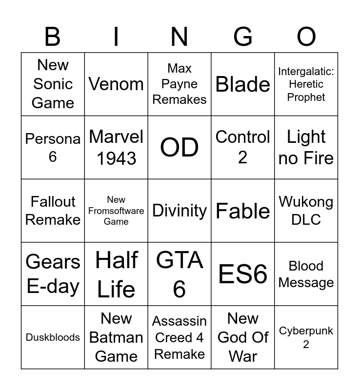 This bingo card has a free space and 24 words: Half Life, New Batman Game, OD, Duskbloods, Intergalatic: Heretic Prophet, New Sonic Game, Persona 6, Venom, Fable, GTA 6, Control 2, Fallout Remake, ES6, Blood Message, Marvel 1943, New God Of War, Wukong DLC, Max Payne Remakes, Light no Fire, New Fromsoftware Game, Cyberpunk 2, Gears E-day, Blade and Assassin Creed 4 Remake.