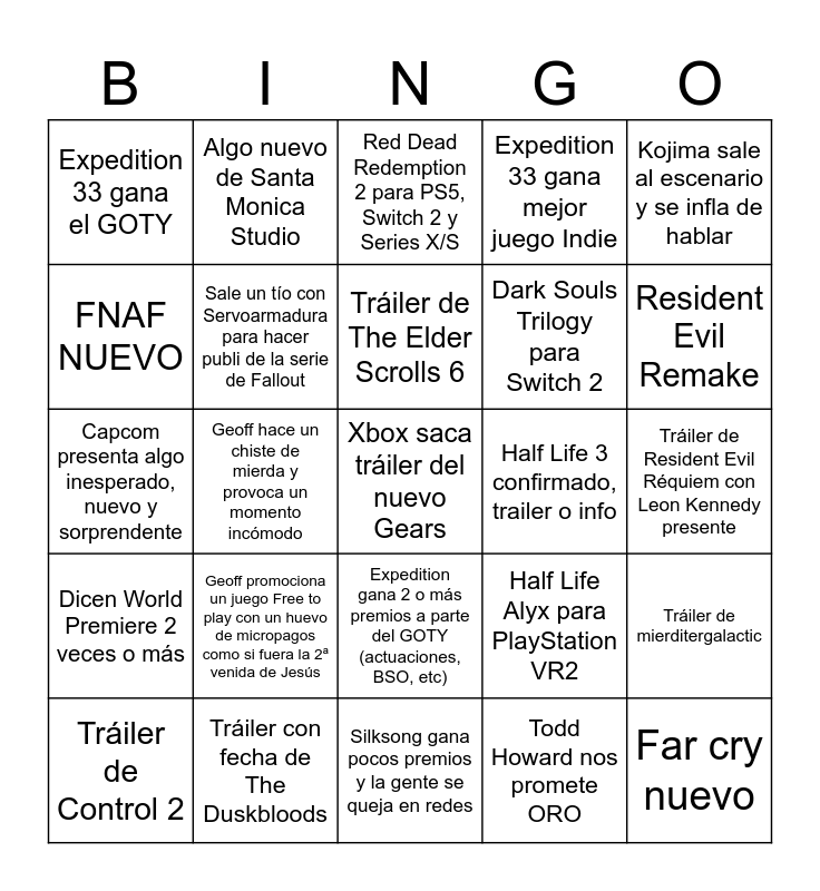This bingo card has a free space and 24 words: Geoff promociona un juego Free to play con un huevo de micropagos como si fuera la 2ª venida de Jesús, Tráiler con fecha de The Duskbloods, Tráiler de The Elder Scrolls 6, Tráiler de Control 2, Kojima sale al escenario y se infla de hablar, Expedition 33 gana el GOTY, FNAF NUEVO, Algo nuevo de Santa Monica Studio, Half Life 3 confirmado, trailer o info, Expedition gana 2 o más premios a parte del GOTY (actuaciones, BSO, etc), Dark Souls Trilogy para Switch 2, Capcom presenta algo inesperado, nuevo y sorprendente, Half Life Alyx para PlayStation VR2, Tráiler de mierditergalactic, Sale un tío con Servoarmadura para hacer publi de la serie de Fallout, Todd Howard nos promete ORO, Tráiler de Resident Evil Réquiem con Leon Kennedy presente, Red Dead Redemption 2 para PS5, Switch 2 y Series X/S, Resident Evil Remake, Geoff hace un chiste de mierda y provoca un momento incómodo, Far cry nuevo, Dicen World Premiere 2 veces o más, Expedition 33 gana mejor juego Indie and Silksong gana pocos premios y la gente se queja en redes.