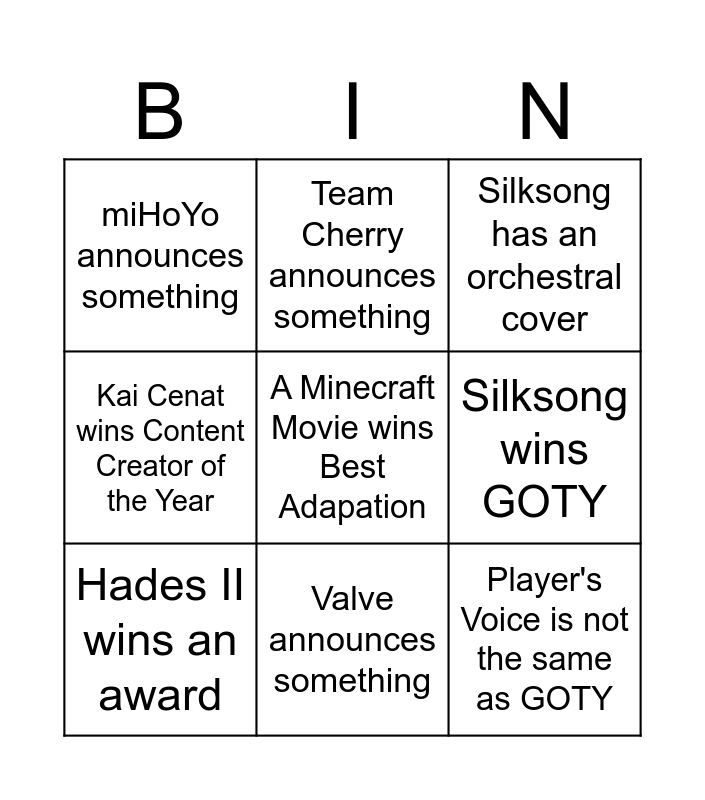 This bingo card has a free space and 8 words: Silksong wins GOTY, Silksong has an orchestral cover, Team Cherry announces something, Hades II wins an award, miHoYo announces something, Player's Voice is not the same as GOTY, Kai Cenat wins Content Creator of the Year and Valve announces something.