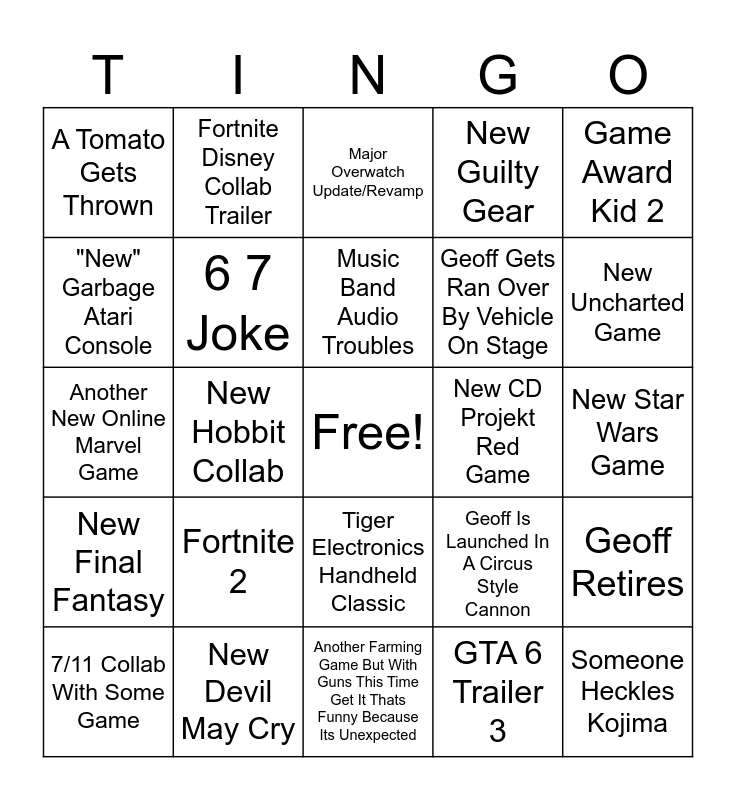 This bingo card has a free space and 24 words: Fortnite 2, New Devil May Cry, Music Band Audio Troubles, 7/11 Collab With Some Game, Game Award Kid 2, A Tomato Gets Thrown, "New" Garbage Atari Console, Fortnite Disney Collab Trailer, New CD Projekt Red Game, Tiger Electronics Handheld Classic, Geoff Gets Ran Over By Vehicle On Stage, Another New Online Marvel Game, Geoff Is Launched In A Circus Style Cannon, Geoff Retires, 6 7 Joke, GTA 6 Trailer 3, New Star Wars Game, Major Overwatch Update/Revamp, New Uncharted Game, New Hobbit Collab, Someone Heckles Kojima, New Final Fantasy, New Guilty Gear and Another Farming Game But With Guns This Time Get It Thats Funny Because Its Unexpected.