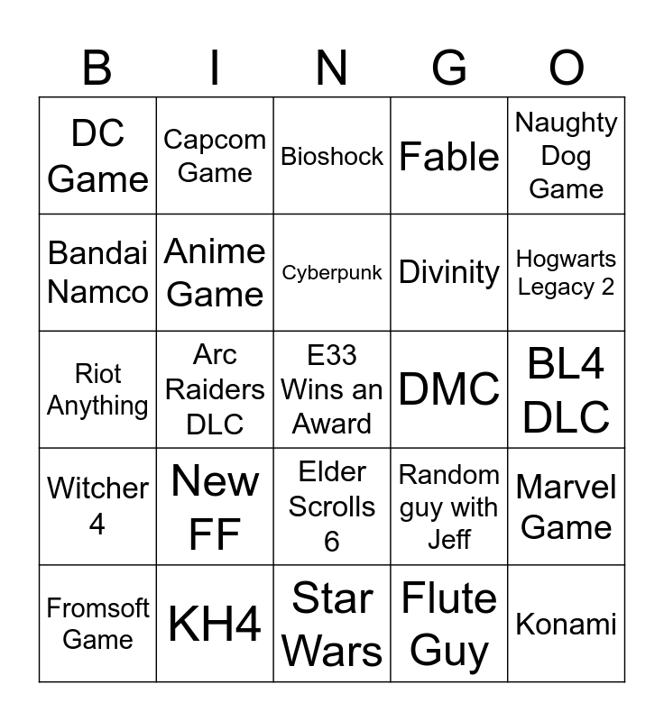 This bingo card has a free space and 24 words: New FF, KH4, Cyberpunk, Fromsoft Game, Naughty Dog Game, DC Game, Bandai Namco, Capcom Game, DMC, Elder Scrolls 6, Divinity, Riot Anything, Random guy with Jeff, Marvel Game, Anime Game, Flute Guy, BL4 DLC, Bioshock, Hogwarts Legacy 2, Arc Raiders DLC, Konami, Witcher 4, Fable and Star Wars.