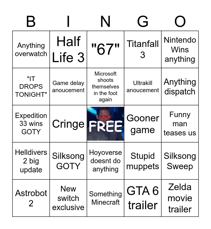 This bingo card has a free space and 24 words: Silksong GOTY, New switch exclusive, Microsoft shoots themselves in the foot again, Astrobot 2, Nintendo Wins anything, Anything overwatch, "IT DROPS TONIGHT", Half Life 3, Gooner game, Hoyoverse doesnt do anything, Ultrakill anoucement, Expedition 33 wins GOTY, Stupid muppets, Silksong Sweep, Game delay anoucement, GTA 6 trailer, Funny man teases us, "67", Anything dispatch, Cringe, Zelda movie trailer, Helldivers 2 big update, Titanfall 3 and Something Minecraft.