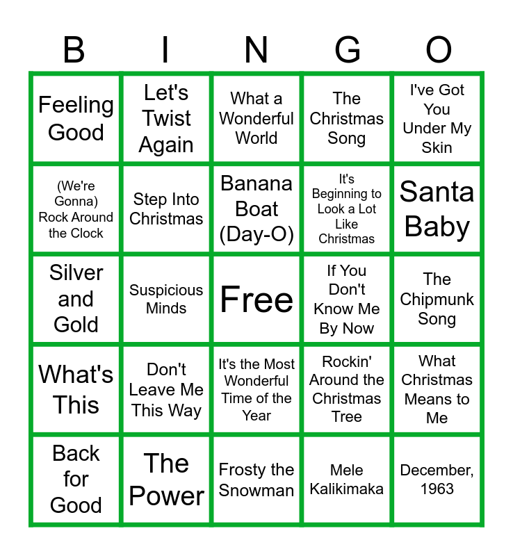 This bingo card has a free space and 24 words: Don't Leave Me This Way, The Power, Banana Boat (Day-O), Back for Good, I've Got You Under My Skin, Feeling Good, (We're Gonna) Rock Around the Clock, Let's Twist Again, If You Don't Know Me By Now, It's the Most Wonderful Time of the Year, It's Beginning to Look a Lot Like Christmas, Silver and Gold, Rockin' Around the Christmas Tree, What Christmas Means to Me, Step Into Christmas, Mele Kalikimaka, The Chipmunk Song, What a Wonderful World, Santa Baby, Suspicious Minds, December, 1963, What's This, The Christmas Song and Frosty the Snowman.