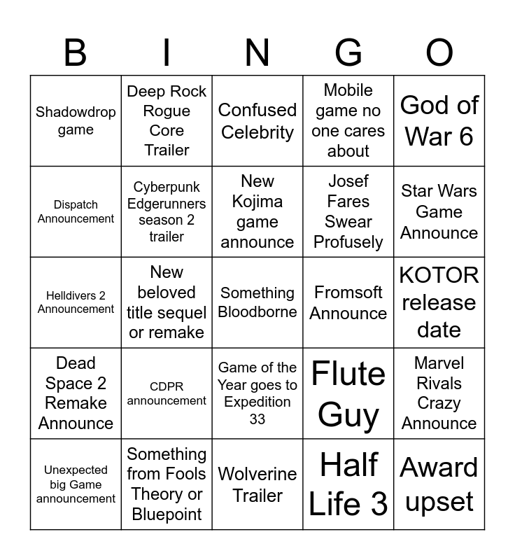 This bingo card has 25 words: CDPR announcement, Wolverine Trailer, New Kojima game announce, Unexpected big Game announcement, God of War 6, Shadowdrop game, Dispatch Announcement, Deep Rock Rogue Core Trailer, Fromsoft Announce, Game of the Year goes to Expedition 33, Josef Fares Swear Profusely, Helldivers 2 Announcement, Flute Guy, Marvel Rivals Crazy Announce, Cyberpunk Edgerunners season 2 trailer, Award upset, KOTOR release date, Confused Celebrity, Star Wars Game Announce, New beloved title sequel or remake, Something Bloodborne, Something from Fools Theory or Bluepoint, Dead Space 2 Remake Announce, Mobile game no one cares about and Half Life 3.