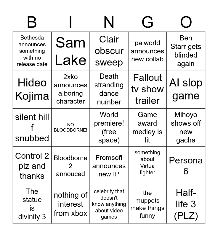 This bingo card has a free space and 24 words: Bloodborne 2 annouced, nothing of interest from xbox, Death stranding dance number, The statue is divinity 3, Ben Starr gets blinded again, Bethesda announces something with no release date, Hideo Kojima, Sam Lake, Game award medley is lit, Fromsoft announces new IP, Fallout tv show trailer, silent hill f snubbed, something about Virtua fighter, Persona 6, 2xko announces a boring character, the muppets make things funny, Mihoyo shows off new gacha, Clair obscur sweep, AI slop game, NO BLOODBORNE!, Half-life 3 (PLZ), Control 2 plz and thanks, palworld announces new collab and celebrity that doesn't know anything about video games.