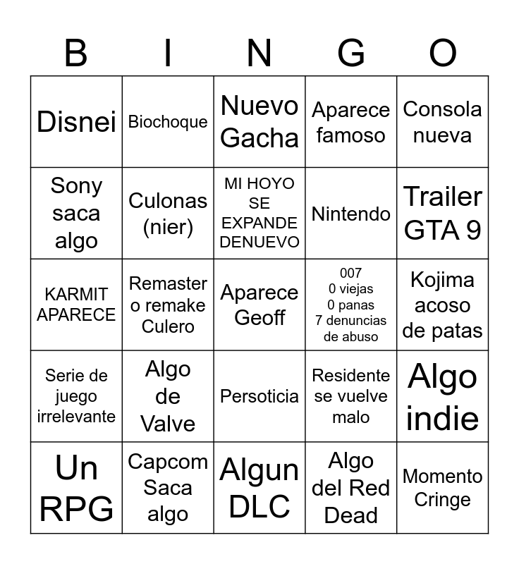 This bingo card has a free space and 24 words: Algo de Valve, Capcom Saca algo, MI HOYO SE EXPANDE DENUEVO, Un RPG, Consola nueva, Disnei, Sony saca algo, Biochoque, 007 0 viejas 0 panas 7 denuncias de abuso, Persoticia, Nintendo, KARMIT APARECE, Residente se vuelve malo, Algo indie, Culonas (nier), Algo del Red Dead, Kojima acoso de patas, Nuevo Gacha, Trailer GTA 9, Remaster o remake Culero, Momento Cringe, Serie de juego irrelevante, Aparece famoso and Algun DLC.