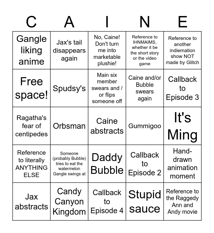This bingo card has a free space and 40 words: Mention of Kaufmo, Ribbit, Queenie, or anybody else who's been abstracted, Ragatha's fear of centipedes, Kinger's collection and / or programming experience, Spudsy's, Candy Canyon Kingdom, Daddy Bubble, Main six member swears and / or flips someone off, Reference to another Glitch show, Reference to another indiemation show NOT made by Glitch, Reference to literally ANYTHING ELSE, Orbsman, Reference to IHNMAIMS, whether it be the short story or the video game, Reference to the Raggedy Ann and Andy movie, It's Ming, Gummigoo, Someone (probably Bubble) tries to eat the watermelon Gangle swings at, Disappearing Man shows up (but only momtarily), Gangle liking anime, We learn the real name of one of the main six, No, Caine! Don't turn me into marketable plushie!, Hand-drawn animation moment, Stupid sauce, Caine and/or Bubble swears again, Free space!, Jax's tail is still there, Pomni abstracts, Gangle abstracts, One of the main six abstracts, Zooble abstracts, Kinger abstracts, Ragatha abstracts, Jax abstracts, Callback to Episode 1, Callback to Episode 2, Callback to Episode 3, Callback to Episode 4, Callback to Episode 5, Callback to Episode 6, Jax's tail disappears again and Let's do the time warp again!.