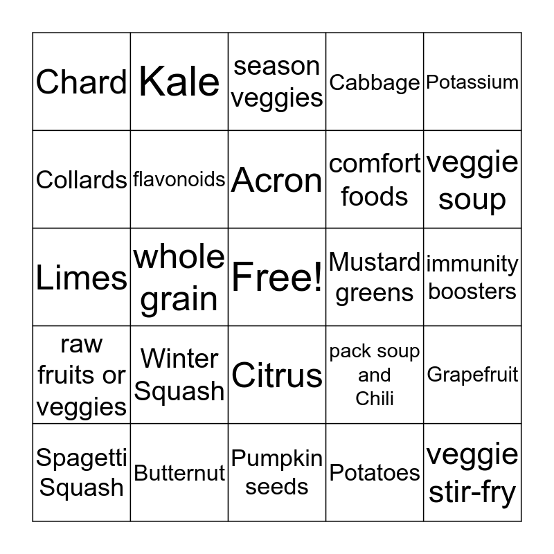 This bingo card has a free space and 24 words: Winter Squash, Butternut, Acron, Spagetti Squash, Potassium, Chard, Collards, Kale, Mustard greens, Citrus, comfort foods, Limes, pack soup and Chili, Grapefruit, flavonoids, Potatoes, immunity boosters, season veggies, veggie soup, whole grain, veggie stir-fry, raw fruits or veggies, Cabbage and Pumpkin seeds.