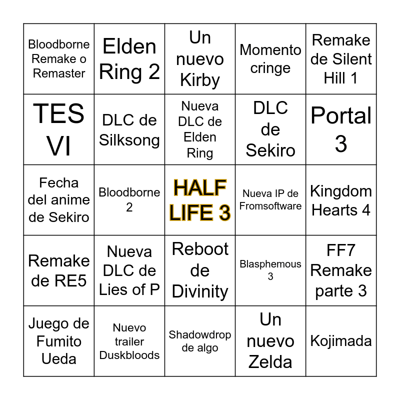 This bingo card has a free space and 24 words: Nueva DLC de Lies of P, Nuevo trailer Duskbloods, Nueva DLC de Elden Ring, Juego de Fumito Ueda, Remake de Silent Hill 1, Bloodborne Remake o Remaster, TES VI, Elden Ring 2, Nueva IP de Fromsoftware, Reboot de Divinity, DLC de Sekiro, Fecha del anime de Sekiro, Blasphemous 3, FF7 Remake parte 3, DLC de Silksong, Un nuevo Zelda, Kingdom Hearts 4, Un nuevo Kirby, Portal 3, Bloodborne 2, Kojimada, Remake de RE5, Momento cringe and Shadowdrop de algo.