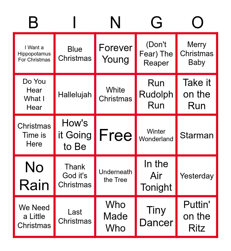 This bingo card has a free space and 24 words: Thank God it's Christmas, Last Christmas, White Christmas, We Need a Little Christmas, Merry Christmas Baby, I Want a Hippopotamus For Christmas, Do You Hear What I Hear, Blue Christmas, Winter Wonderland, Underneath the Tree, Run Rudolph Run, Christmas Time is Here, In the Air Tonight, Yesterday, Hallelujah, Tiny Dancer, Starman, Forever Young, Take it on the Run, How's it Going to Be, Puttin' on the Ritz, No Rain, (Don't Fear) The Reaper and Who Made Who.