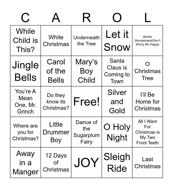 This bingo card has a free space and 75 words: All I want for Christmas is You, Rocking around the christmas tree, Underneath the Tree, It’s beginning to look a lot like Christmas, Mistletoe, Merry Christmas, Happy Holidays, Snowman, Holly Jolly Christmas, What Christmas Means to Me, Have Yourself a Merry Little Christmas, It’s the Most Wonderful Time of the Year, Mele Kalikimaka, Mary’s Boy Child, Jingle Bells, Do you Hear what I hear?, Do they know its Christmas?, Jingle Bell Rock, Last Christmas, Blue Christmas, Winter Wonderland/Don’t Worry Be Happy, Frosty the Snowman, You’re A Mean One, Mr. Grinch, Carol of the Bells, White Christmas, Let it Snow, I Want a Hippopotamus For Christmas, The Chipmunk Song, Mary, Did you Know?, Feliz Navidad, When A Child is Born, Here Comes Santa Claus, Wonderful Christmastime, Joy to the World, O Holy Night, O Christmas Tree, Santa Claus is Coming to Town, Silent Night, Like It’s Christmas, I’ll Be Home for Christmas, Sleigh Ride, A Holly Jolly Christmas, Deck the Hall, Rudolph the Red-Nosed Reindeer, O Come, All Ye Faithful, Up on the Housetop, God Rest Ye Merry Gentlemen, Away in a Manger, While Child is This?, I’m Getting Nutting for Christmas, We Wish You a Merry Christmas, It Came Upon a Midnight Clear, Dance of the Sugarplum Fairy, The First Noel (Born is the King), Let it Go, Hark! The Herald Angel Sing, The Christmas Song, Run Rudolph Run, Christmas Tree Farm, O Come, O Come Emmanuel, We Need a Little Christmas, Little Drummer Boy, Here We Come a-Caroling/We Wish you a Merry Christmas, Santa Tell Me, Santa’s Coming For Us, Silver Bells, Silver and Gold, The Present, Lift Up Your Eyes, Linus and Lucy, All I Want For Christmas is My Two Front Teeth, Where are you for Christmas?, 12 Days of Christmas, Christmas Morning, JOY and Light of Christmas.
