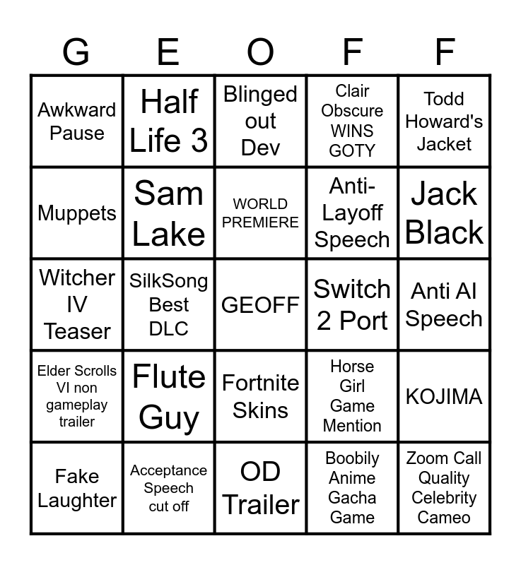 This bingo card has a free space and 24 words: Flute Guy, Acceptance Speech cut off, WORLD PREMIERE, Fake Laughter, Todd Howard's Jacket, Awkward Pause, Muppets, Half Life 3, Switch 2 Port, Fortnite Skins, Anti-Layoff Speech, Witcher IV Teaser, Horse Girl Game Mention, KOJIMA, Sam Lake, Boobily Anime Gacha Game, Anti AI Speech, Blinged out Dev, Jack Black, SilkSong Best DLC, Zoom Call Quality Celebrity Cameo, Elder Scrolls VI non gameplay trailer, Clair Obscure WINS GOTY and OD Trailer.