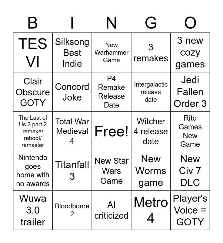 This bingo card has a free space and 24 words: Titanfall 3, Bloodborne 2, P4 Remake Release Date, Wuwa 3.0 trailer, 3 new cozy games, TES VI, Clair Obscure GOTY, Silksong Best Indie, Witcher 4 release date, New Star Wars Game, Intergalactic release date, The Last of Us 2 part 2 remake/ reboot/ remaster, New Worms game, New Civ 7 DLC, Concord Joke, Metro 4, Rito Games New Game, New Warhammer Game, Jedi Fallen Order 3, Total War Medieval 4, Player's Voice = GOTY, Nintendo goes home with no awards, 3 remakes and AI criticized.
