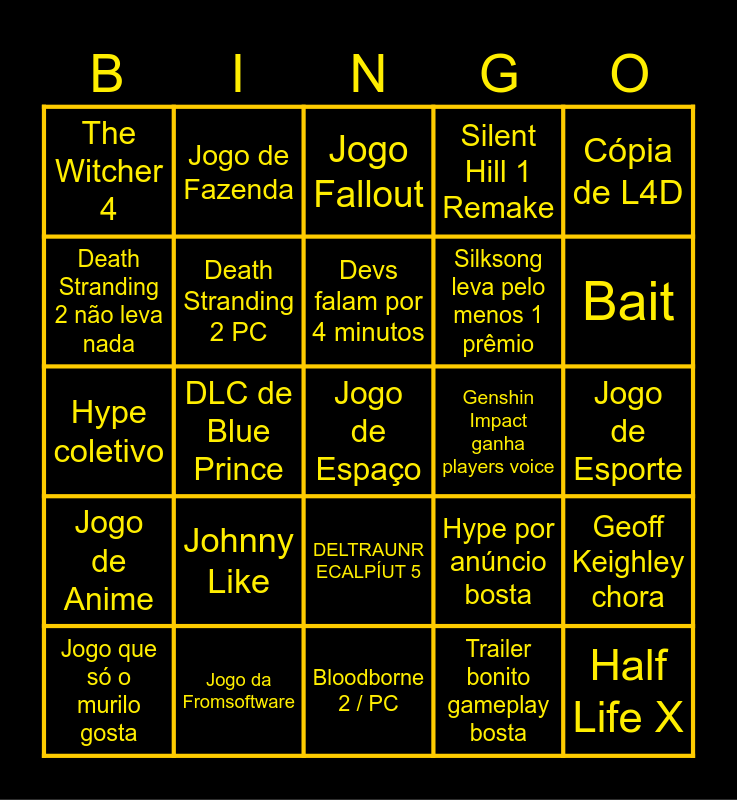 This bingo card has a free space and 47 words: Momento Cringe, Half Life X, Silksong DLC, Bloodborne 2 / PC, Johnny Like, Mais um Genshin Impact like, Jogo de Fazenda, Clair Obscur leva 3+ prêmios, Death Stranding 2 não leva nada, OD, Death Stranding 2 PC, Silent Hill 1 Remake, Geoff Keighley chora, Hype por anúncio bosta, Okami 2, Jogo de Ritmo, Devs falam por 4 minutos, Genshin Impact ganha players voice, Wolverine, Cópia de L4D, DLC de Blue Prince, Trailer bonito gameplay bosta, The Witcher 4, Silksong leva pelo menos 1 prêmio, Gonha Perdida, Bait, Jogo que só o murilo gosta, Take PÉSSIMO, DELTRAUNR ECALPÍUT 5, Jogo de Anime, Persona 6, Peggle-like, God of War, Revelação do Leon RE9, Duskbloods, Jogo da Fromsoftware, Jogo de Esporte, KOJIMA aparece e farma aura, Physint, Anúncio de Fortnite, The Elder Scrolls 6, Jogo Fallout, Hype coletivo, Jogo do Jonathan Blow decepciona, FRIENDSLOP, Make FPS great again and Mais um cineasta em OD.