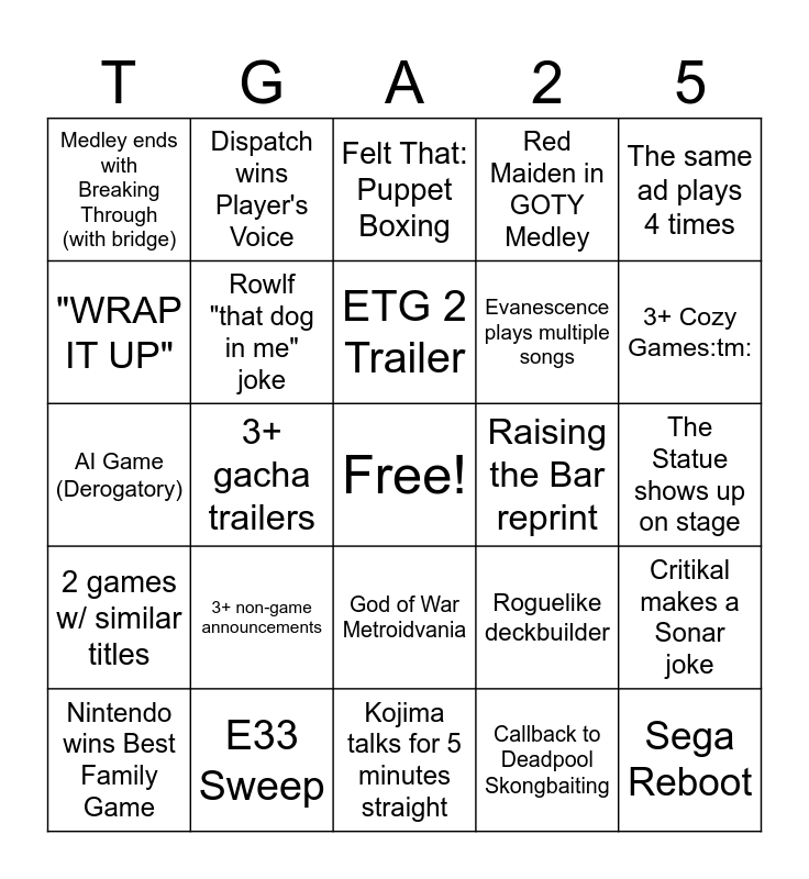 This bingo card has a free space and 24 words: 3+ non-game announcements, E33 Sweep, ETG 2 Trailer, Nintendo wins Best Family Game, The same ad plays 4 times, Medley ends with Breaking Through (with bridge), "WRAP IT UP", Dispatch wins Player's Voice, Raising the Bar reprint, God of War Metroidvania, Evanescence plays multiple songs, AI Game (Derogatory), Roguelike deckbuilder, Critikal makes a Sonar joke, Rowlf "that dog in me" joke, Callback to Deadpool Skongbaiting, The Statue shows up on stage, Felt That: Puppet Boxing, 3+ Cozy Games:tm:, 3+ gacha trailers, Sega Reboot, 2 games w/ similar titles, Red Maiden in GOTY Medley and Kojima talks for 5 minutes straight.