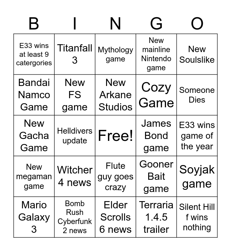 This bingo card has a free space and 29 words: Mario Galaxy 3, Divinity 3, Helldivers update, Hideo Kojima gets slopped for >5mins, E33 wins at least 9 catergories, Mythology game, New FS game, Witcher 4 news, James Bond game, Bomb Rush Cyberfunk 2 news, E33 wins game of the year, Silent Hill f wins nothing, Elder Scrolls 6 news, Terraria 1.4.5 trailer, Someone Dies, New Bluepoint remake, Flute guy goes crazy, New megaman game, New Soulslike, New Gacha Game, Gooner Bait game, Nier game, Cozy Game, Bandai Namco Game, New mainline Nintendo game, Titanfall 3, Soyjak game, New Arkane Studios and Ark 2.