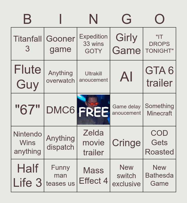 This bingo card has a free space and 34 words: Silksong GOTY, New switch exclusive, Microsoft shoots themselves in the foot again, Astrobot 2, Nintendo Wins anything, Anything overwatch, "IT DROPS TONIGHT", Half Life 3, Gooner game, Hoyoverse doesnt do anything, Ultrakill anoucement, Expedition 33 wins GOTY, Stupid muppets, Silksong Sweep, Game delay anoucement, GTA 6 trailer, Funny man teases us, "67", Anything dispatch, Cringe, Zelda movie trailer, Helldivers 2 big update, Titanfall 3, Something Minecraft, Mass Effect 4, New Bathesda Game, Girly Game, Dead Franchise Revival, AI, Flute Guy, Valve Appears, DMC6, COD Gets Roasted and Battlefield 6 Gets anything.
