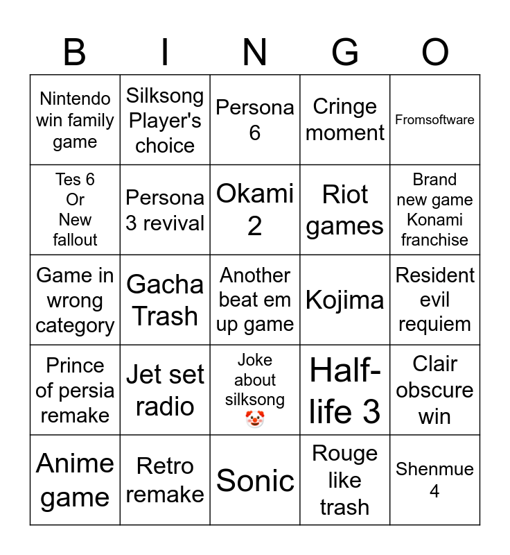 This bingo card has 25 words: Jet set radio, Sonic, Okami 2, Anime game, Fromsoftware, Nintendo win family game, Tes 6 Or New fallout, Silksong Player's choice, Kojima, Joke about silksong 🤡, Riot games, Game in wrong category, Half-life 3, Clair obscure win, Persona 3 revival, Shenmue 4, Resident evil requiem, Persona 6, Brand new game Konami franchise, Gacha Trash, Another beat em up game, Retro remake, Prince of persia remake, Cringe moment and Rouge like trash.
