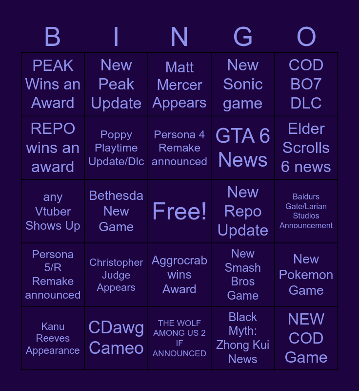 This bingo card has a free space and 24 words: Christopher Judge Appears, CDawg Cameo, Persona 4 Remake announced, Kanu Reeves Appearance, COD BO7 DLC, PEAK Wins an Award, REPO wins an award, New Peak Update, New Repo Update, Aggrocrab wins Award, GTA 6 News, any Vtuber Shows Up, New Smash Bros Game, New Pokemon Game, Poppy Playtime Update/Dlc, Black Myth: Zhong Kui News, Baldurs Gate/Larian Studios Announcement, Matt Mercer Appears, Elder Scrolls 6 news, Bethesda New Game, NEW COD Game, Persona 5/R Remake announced, New Sonic game and THE WOLF AMONG US 2 IF ANNOUNCED.