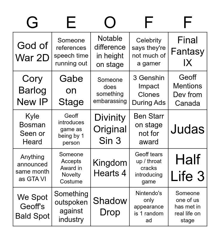 This bingo card has a free space and 24 words: Someone Accepts Award in Novelty Costume, Something outspoken against industry, Someone does something embarassing, We Spot Geoff's Bald Spot, Final Fantasy IX, God of War 2D, Cory Barlog New IP, Someone references speech time running out, Ben Starr on stage not for award, Kingdom Hearts 4, 3 Genshin Impact Clones During Ads, Kyle Bosman Seen or Heard, Geoff tears up / throat cracks introducing game, Half Life 3, Gabe on Stage, Nintendo's only appearance is 1 random ad, Judas, Notable difference in height on stage, Geoff Mentions Dev from Canada, Geoff introduces game as being by 1 person, Someone one of us has met in real life on stage, Anything announced same month as GTA VI, Celebrity says they're not much of a gamer and Shadow Drop.