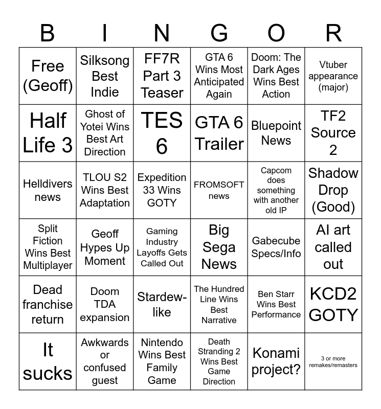 This bingo card has 36 words: The Hundred Line Wins Best Narrative, Stardew-like, Death Stranding 2 Wins Best Game Direction, Half Life 3, Split Fiction Wins Best Multiplayer, FROMSOFT news, Ghost of Yotei Wins Best Art Direction, Nintendo Wins Best Family Game, Doom: The Dark Ages Wins Best Action, Ben Starr Wins Best Performance, TF2 Source 2, GTA 6 Wins Most Anticipated Again, KCD2 GOTY, TLOU S2 Wins Best Adaptation, GTA 6 Trailer, Free (Geoff), Dead franchise return, Capcom does something with another old IP, Helldivers news, FF7R Part 3 Teaser, Expedition 33 Wins GOTY, Geoff Hypes Up Moment, Big Sega News, Gaming Industry Layoffs Gets Called Out, Gabecube Specs/Info, Silksong Best Indie, Bluepoint News, Awkwards or confused guest, TES 6, Vtuber appearance (major), 3 or more remakes/remasters, It sucks, AI art called out, Shadow Drop (Good), Doom TDA expansion and Konami project?.