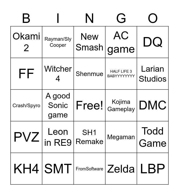 This bingo card has a free space and 24 words: Leon in RE9, SMT, Shenmue, KH4, DQ, Okami 2, FF, Rayman/Sly Cooper, Kojima Gameplay, SH1 Remake, HALF LIFE 3 BABYYYYYYYY, Crash/Spyro, Megaman, Todd Game, Witcher 4, Zelda, DMC, New Smash, Larian Studios, A good Sonic game, LBP, PVZ, AC game and FromSoftware.