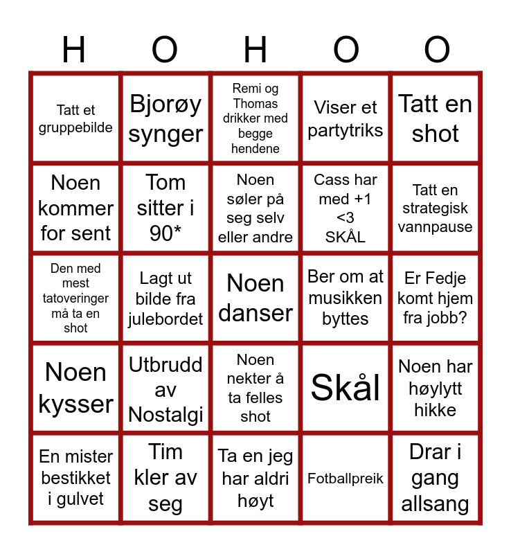 This bingo card has 25 words: Utbrudd av Nostalgi, Ta en jeg har aldri høyt, Noen søler på seg selv eller andre, En mister bestikket i gulvet, Tatt en shot, Tatt et gruppebilde, Noen kommer for sent, Bjorøy synger, Ber om at musikken byttes, Noen nekter å ta felles shot, Cass har med +1 <3 SKÅL, Den med mest tatoveringer må ta en shot, Skål, Noen har høylytt hikke, Tom sitter i 90*, Drar i gang allsang, Er Fedje komt hjem fra jobb?, Remi og Thomas drikker med begge hendene, Tatt en strategisk vannpause, Lagt ut bilde fra julebordet, Noen danser, Tim kler av seg, Noen kysser, Viser et partytriks and Fotballpreik.