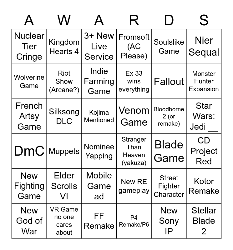 This bingo card has 36 words: New RE gameplay, Mobile Game ad, P4 Remake/P6, Wolverine Game, DmC, Venom Game, Riot Show (Arcane?), FF Remake, Soulslike Game, Street Fighter Character, Monster Hunter Expansion, Fromsoft (AC Please), Kotor Remake, Silksong DLC, Ex 33 wins everything, Nuclear Tier Cringe, New Fighting Game, Bloodborne 2 (or remake), French Artsy Game, 3+ New Live Service, Kojima Mentioned, Muppets, Stranger Than Heaven (yakuza), Nominee Yapping, Blade Game, Kingdom Hearts 4, Fallout, VR Game no one cares about, Indie Farming Game, Nier Sequal, Stellar Blade 2, New God of War, CD Project Red, Star Wars: Jedi __, Elder Scrolls VI and New Sony IP.