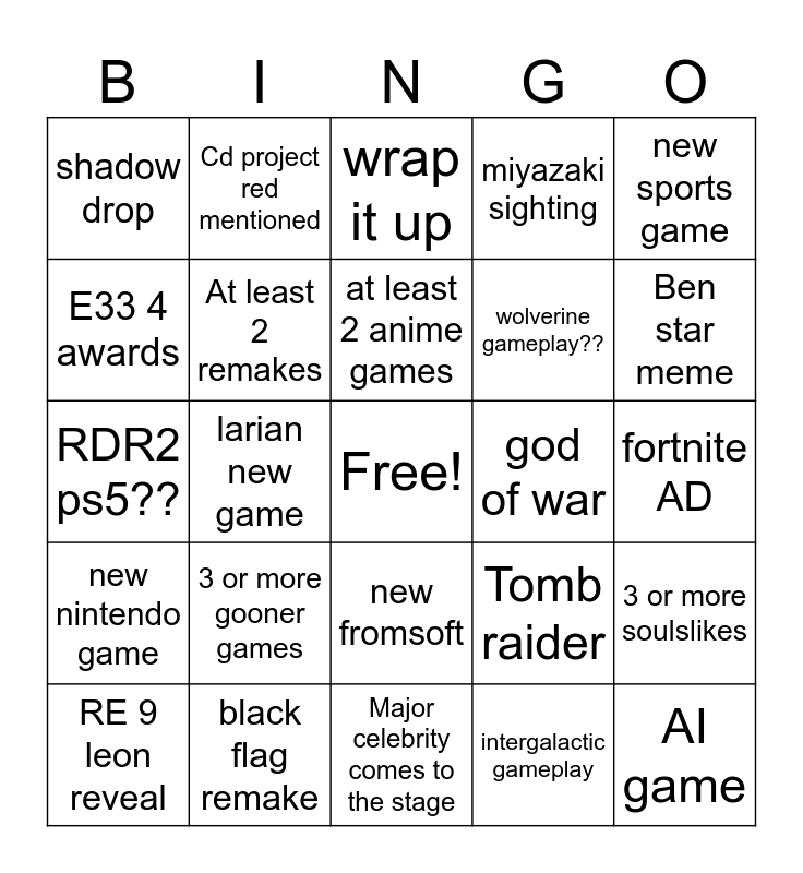 This bingo card has a free space and 24 words: 3 or more gooner games, black flag remake, at least 2 anime games, RE 9 leon reveal, new sports game, shadow drop, E33 4 awards, Cd project red mentioned, god of war, new fromsoft, wolverine gameplay??, RDR2 ps5??, Tomb raider, 3 or more soulslikes, At least 2 remakes, intergalactic gameplay, fortnite AD, wrap it up, Ben star meme, larian new game, AI game, new nintendo game, miyazaki sighting and Major celebrity comes to the stage.