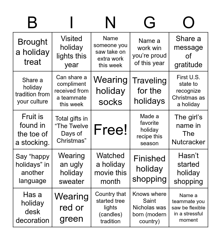 This bingo card has a free space and 24 words: Wearing an ugly holiday sweater, Wearing red or green, Wearing holiday socks, Has a holiday desk decoration, Share a message of gratitude, Brought a holiday treat, Share a holiday tradition from your culture, Visited holiday lights this year, Made a favorite holiday recipe this season, Watched a holiday movie this month, Traveling for the holidays, Fruit is found in the toe of a stocking., Finished holiday shopping, Hasn’t started holiday shopping, Can share a compliment received from a teammate this week, Knows where Saint Nicholas was born (modern country), The girl’s name in The Nutcracker, Name someone you saw take on extra work this week, First U.S. state to recognize Christmas as a holiday, Total gifts in “The Twelve Days of Christmas”, Name a teammate you saw be flexible in a stressful moment, Say “happy holidays” in another language, Name a work win you’re proud of this year and Country that started tree lights (candles) tradition.