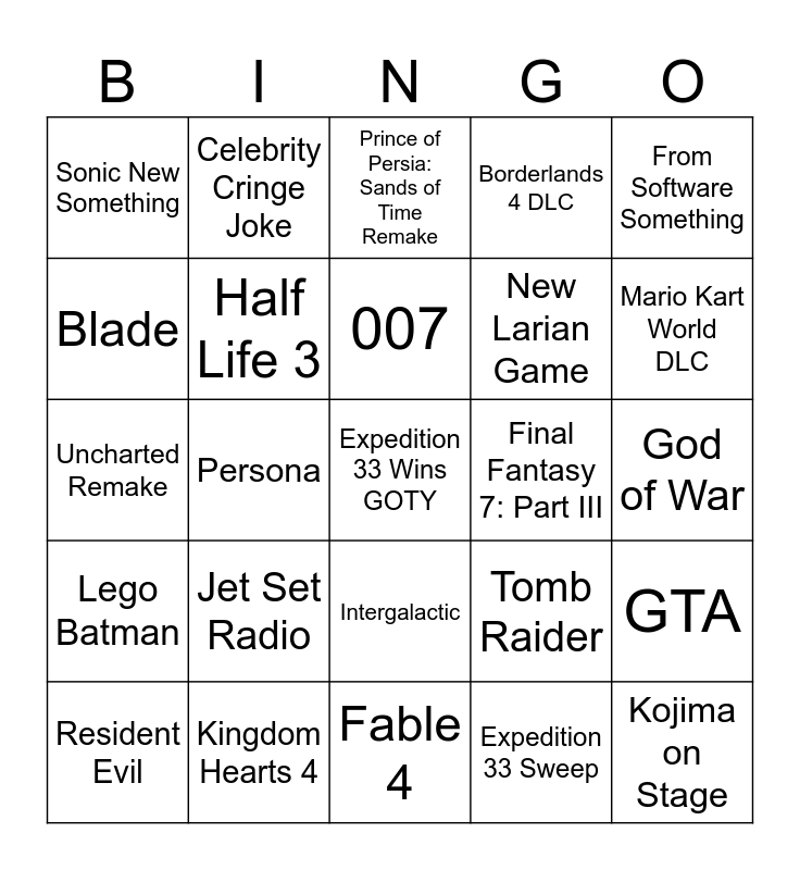 This bingo card has a free space and 24 words: Jet Set Radio, Kingdom Hearts 4, 007, Resident Evil, From Software Something, Sonic New Something, Blade, Celebrity Cringe Joke, Final Fantasy 7: Part III, Intergalactic, New Larian Game, Uncharted Remake, Tomb Raider, GTA, Half Life 3, Expedition 33 Sweep, God of War, Prince of Persia: Sands of Time Remake, Mario Kart World DLC, Persona, Kojima on Stage, Lego Batman, Borderlands 4 DLC and Fable 4.