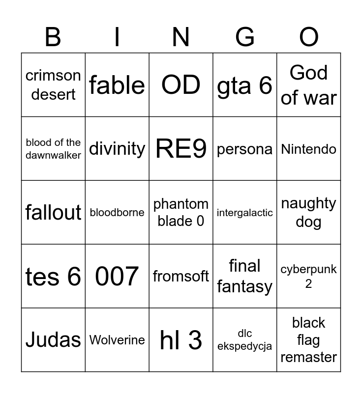 This bingo card has a free space and 24 words: 007, Wolverine, RE9, Judas, God of war, crimson desert, blood of the dawnwalker, fable, intergalactic, fromsoft, persona, fallout, final fantasy, cyberpunk 2, divinity, dlc ekspedycja, naughty dog, OD, Nintendo, bloodborne, black flag remaster, tes 6, gta 6 and hl 3.